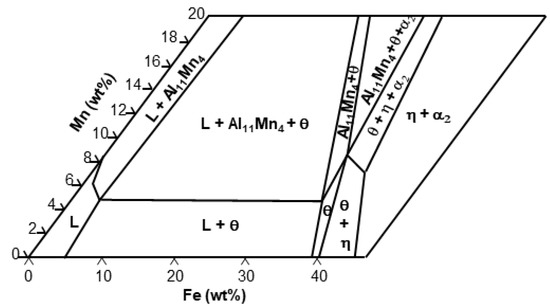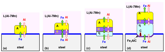 Figure 16 is a schematic diagram of the processes formed by inter-diffusion in the order of phases. At interface Al11Mn4/liquid phase (L) formed first, and when Fe diffused toward the liquid phase and Al diffused toward the solid phase Al11Mn4, the Al11Mn4 phase grew. At the Al11Mn4 phase/steel interface, Al diffused toward the steel, and when Fe diffused into the A phase, the Al concentration decreased in the region close to the steel. On the other hand, since the Fe concentration increased, the Fe-rich phase formed. The θ phase (FeAl3) formed when the Fe concentration increased from 0 to 4 wt.% or more in the (Al-7 wt.% Mn)-x wt.% Fe quasi-binary diagram in Figure 15.