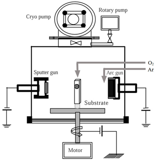 The Cr2O3 film was deposited on single-crystalline Si wafer with (100) orientation by using a hybrid coating system. In this work, the only arc ion plating was used. The deposition chamber is a cylindrical shell structure (the diameter of 500 mm, height of 500 mm). The Cr target (99.99 wt % purity) was fixed at a distance of 350 mm from the rotating sample holder that with a diameter of 80 mm connected with arc cathode. The bias supply with a direct current (IDP-1010, KODIVAC Co., Ltd., Seoul, Korea) provided substrate bias voltage. A simulated diagram of the hybrid coating system is presented in Figure 1.