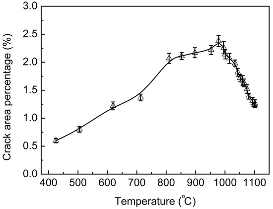 In addition, the crack area percentage on film surface was used to define the variation of Cr2O3 film characteristics during the heating process, and the corresponding results are shown in Figure 3. It can be seen that the crack area percentage of the film first increased gradually with the increase of heating temperature, and reached the maximum value 2.38% at around 980 °C. Since then, it sharply decreased again with the further increase of heating temperature. The thermal stress and grain growth mainly affected the percentage of crack area of the heat-treated film. It is known that usually there are some compressive residual stresses in AIP.