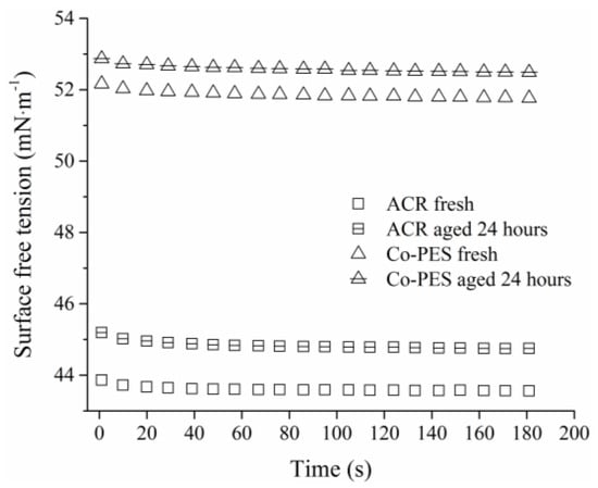 Surface tension time dependence of ACR and Co-PES dispersions; fresh and aged for 24 h at 40 °C.