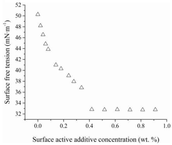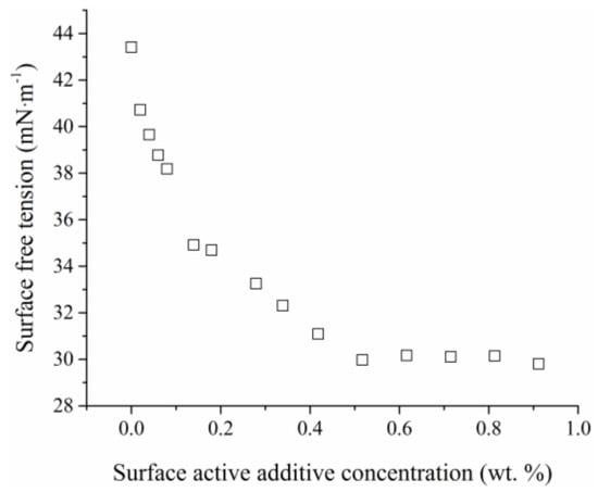 In order to improve wetting properties, the ACR and Co-PES dispersions were modified with the Agent 1. The dependencies of surface tension versus surface active agent concentration show two breaks—at approx. 0.14 wt.% and 0.40 wt.%—which were attributed to the critical aggregation concentration and critical micellar concentration, respectively, of Agent 1 (Figure 2 and Figure 3). The trend of curves seems to be unaffected by the chemical nature of dispersions and Agent 1 is highly efficient already at low concentrations. The addition of 0.14 wt.% provides reduction of SFT value by 15% and 20% for ACR and Co-PES dispersion, respectively, which is favorable for the thin-film coating process. The Agent 1 (as a representative of gemini surfactants) contains two hydrophilic and hydrophobic part within one single molecule, thus its surface active properties (efficiency and effectivity) are remarkably better than would be with their single hydrophilic/hydrophobic analogues [12,13,14].