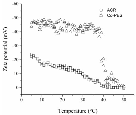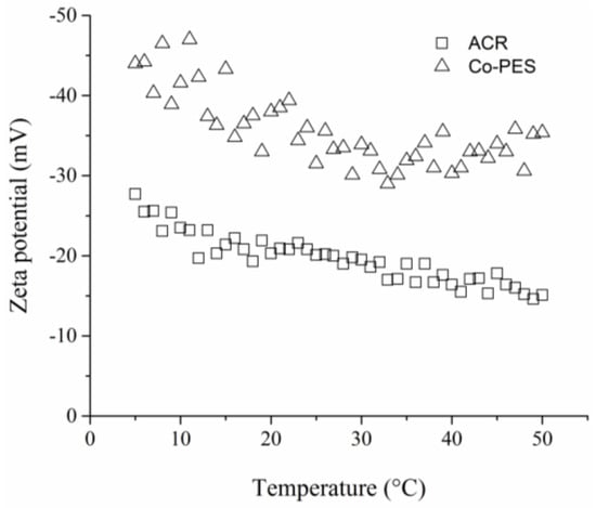 Zeta potential temperature dependence of ACR dispersion (squares) and Co-PES dispersion (triangles).