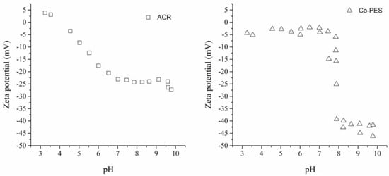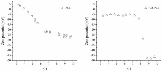Zeta potential pH dependence of ACR dispersion (squares) and Co-PES dispersion (triangles).