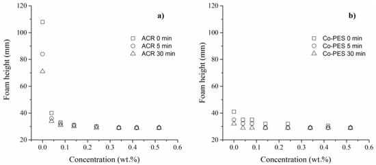 Foaming of both polymeric dispersions was determined as a function of defoaming/wetting agent concentration and time. The results for ACR dispersion (Figure 10a) show higher value of the foam height of pure ACR dispersion, compared to pure Co-PES dispersion (Figure 10b). The foaminess of ACR is 2.6 times higher than for Co-PES. The foam height of pure ACR dispersion was around (108.0 ± 4.0) mm. The first addition of Agent 1 caused lowering of foam height to (40.0 ± 0.5) mm, i.e., more than 60%. As can be seen in the Figure 10a, the foaming of ACR decreases markedly between 0.02 and 0.08 wt.% concentration of the Agent 1 (close to the CAC value). When the concentration of Agent 1 is close to the CMC, the foam height reaches a plateau.