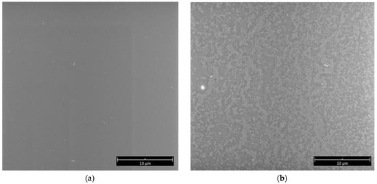 The coating in the laboratory scale was performed solely for the purpose of determination whether the dispersions will wet the substrate and thus would be suitable for the industrial process. Figure 11 displays the surface of virgin and ACR dispersion coated substrates. As can be seen, the manual coating provides a relatively thick (up to 10 microns) layer. In the case of the industrial process, the layer is so thin (partly because of the thin liquid layer deposited with the gravure cyllinder and also due to the biaxial stretching—the dispersion is deposited before the transverse direction orientation takes place), it can hardly be analyzed with any other method than surface tension measurement (either inks or sessile drop method). Testing the substrate with ink revealed the surface free energy of approx. 42, 40, and 62 mJ·m−2 for virgin BOPET, ACR coated BOPET, and Co-PES coated BOPET, respectively.