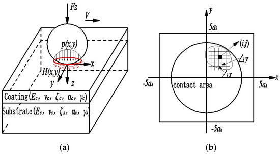 The moving coordinate system (x,y,z) is attached to the ball with plane xOy coinciding with the surface of the coated material; that is, the contact area will remain stationary with respect to the movement of the ball. The normal pressure distribution is p(x,y) N·m−2; then, the friction force distribution, q(x,y) N·m−2, and the distribution of frictional heat flux, H(x,y) W·m−2, are generated within the contact region, with f being the friction coefficient. Their relationships are as follows: