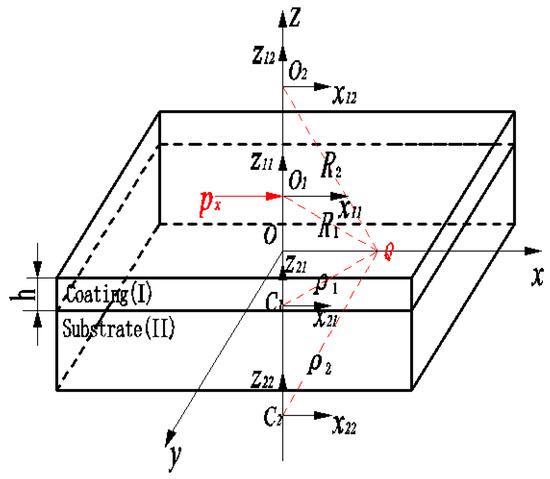 As shown in Figure 4, we can see that coating I, with thickness h, is used to cover substrate II, and is connected only by the interface. Above the coating, there is a free surface, and a tangential force, marked px, is applied at point O1 on said surface and is parallel to the x-axis. A Cartesian coordinate (x,y,z) is chosen with the x-axis and y-axis being along the interface, and the z-axis being perpendicular to the interface and passing through O1. The x-axis and y-axis intersect at O, namely the global point of origin. Coordinate plane xOy coincides with the interface. The image points in the coating space are marked as Ok, and those in the substrate space are marked as Ck. Green’s function for a point tangential load, acting on the surface of a coated isotropic thermoelastic material, can be obtained in the similar way (shown in Section 2.2).
