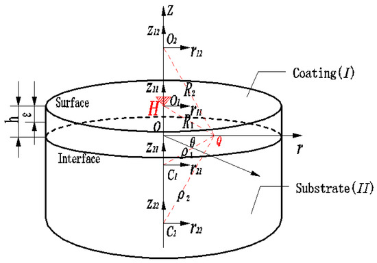 As shown in Figure 5, we can see that coating I, with thickness h, is used to cover substrate II, and is connected only by the interface. Above the coating, there is a free surface, and a moving point heat resource, marked H, is applied at point O1 on said surface. A cylindrical coordinate (r,θ,z) is chosen with the r-axis being along the interface, and the z-axis being perpendicular to the r-axis and passing through O1. The r-axis and z-axis intersect at O, namely, the global point of origin. Coordinate plane rOθ coincides with the interface. The image points in the coating space are marked as Ok and those in the substrate space are marked as Ck. The cyclic recursions and stress and displacement functions for point heat resource are given here.