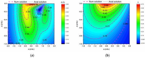 In order to verify the validity of the present model, the numerical results, obtained by setting μ = 1, α = 1, and ζ = 1, are compared with the exact analytical solution given by Johnson and Midlin [21] for the thermoelastic contact problem of solo material semi-space at f = 0.2 and Pe2 = 2.4. The contour plot of the Von Mises stress and temperature on the xz plane are shown in Figure 7a,b, respectively, with numerical results being implied by the dotted line and the analytical results being implied by the solid line. All numerical simulations agree with those from the analytical solutions.