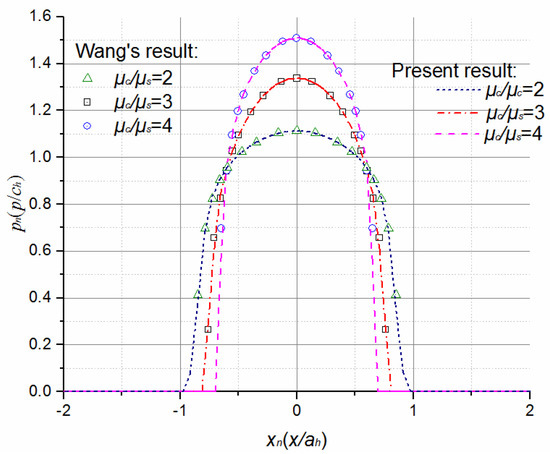 Note that, for verifying the validity of the present model further, the work by Wang [23] for the contact problem of a coated solids without thermal effect can be recovered by assuming V = 0 in the present model. Here, we choose the same material parameters as in Reference [9] and calculate the contact pressure distribution. Figure 8 shows the dimensionless contact stress at h/ah = 0.5, f = 0.2, V = 0 with μc/μs varying from 2 to 4. It is seen that the present results agree very well with Liu’s results.