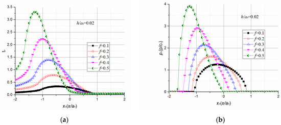 Effect of f on contact characteristics. (a) Effect of f on contact pressure distribution; (b) Effect of f on surface temperature distribution.