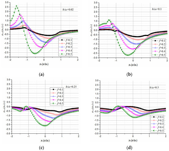 σn−xx along the intersecting line of plane xoz and interface with various f and h/ah when μ = 2, α = 0.3, ζ = 0.5. (a) with various f at h/ah = 0.02; (b) with various f at h/ah = 0.1; (c) with various f at h/ah = 0.25; (d) with various f at h/ah = 0.5.
