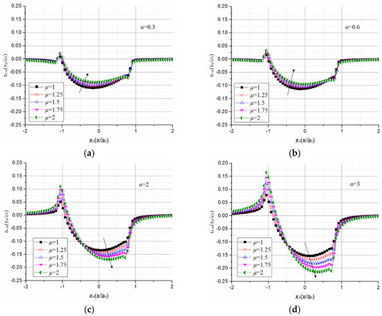 τn−xz along the intersecting line of plane xoz and interface with various α and μ when h/ah = 0.02, ζ = 0.5, f = 0.1. (a) With various μ at α = 0.3; (b) with various μ at α = 0.6; (c) with various μ at α = 2; (d) with various μ at α = 3.