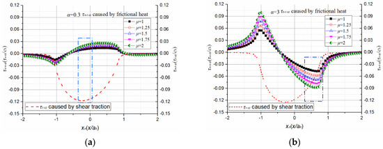 The effects of a coatings’ elastic modulus ratio, μ, on shear stress τn−xz along the intersecting line of plane xoz and the interface are shown in Figure 12, with variations of α at h/ah = 0.02, ζ = 0.5, f = 0.1. As can be inferred from Figure 12c,d, the increase in stiffness of the coating results in a higher interfacial shear stress when α is greater than 1. However, when α is less than 1, the interfacial shear stress decreases dramatically with the increase in the stiffness of the coatings, as can be inferred from Figure 12a,b. With the increase of μ, thermally induced interfacial shear stress τt−xz always increases, as shown in Figure 13. However, the direction of the thermally induced interfacial shear stress component is opposite to that caused by tangential traction when α < 1, as is shown in Figure 13a. Thus, the increase in the thermally induced interfacial shear stress results in the decrease of total interfacial shear stress. While α > 1, the direction of thermally induced interfacial shear stress is the same as that caused by tangential traction, as shown in Figure 13b. Thus, the increase in the interfacial shear stress, which is induced by fractional heat, results in the increase of total interfacial shear stress under the conditions of α > 1.