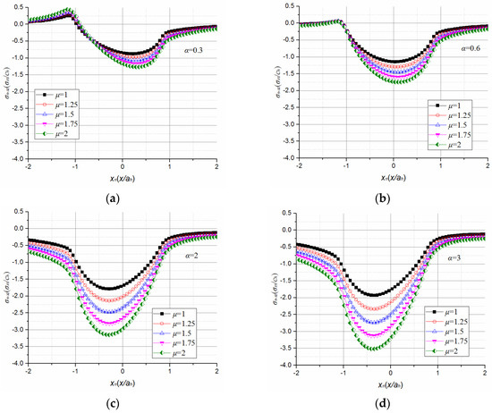 σn−xx along the intersecting line of plane xoz and interface with various α and μ when h/ah = 0.02, ζ = 0.5, f = 0.1. (a) With various μ at α = 0.3; (b) with various μ at α = 0.6; (c) with various μ at α = 2; (d) with various μ at α = 3.