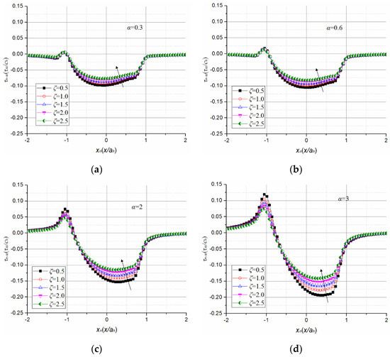 The effects of a coatings’ thermal conductive coefficient and thermal expansion coefficient on the tensile transverse stress along the intersecting line of plane xoz and the interface are provided in Figure 17, with variations of α and ζ at h/ah = 0.02, μ = 2, and f = 0.1. Figure 17a–d indicate that the dependence of interfacial tensile transverse stress on the variations of ζ is negligible.
