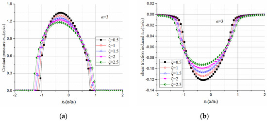 The effects of a coatings’ thermal conductive ratio, ζ, on shear stress τn−xz along the intersecting line of plane xoz and the interface are shown in Figure 15, with variations of α at h/ah = 0.02, μ = 2, and f = 0.1. The results shown in Figure 15 confirm that the increase in the thermal conductive coefficient of a coating is always beneficial in reducing the interfacial shear stress. As mentioned above, contact pressure distribution is co-determined by contact load and surface temperature rise in thermoelastic contact conditions. Figure 16 illustrates that the increase in ζ results in decreases in contact pressure and interfacial shear stress. With respect to Figure 16a, the magnitude of the contact pressure grows in an inverse proportion to ζ, and the magnitude of the contact area is proportional to ζ. The fact that coatings with a higher thermal conductivity can facilitate heat transfer within a coated system is understood to be accountable for contact pressure relaxation. With the dispersing of surface shear traction, interfacial shear stress decreases substantially, as shown in Figure 16b.