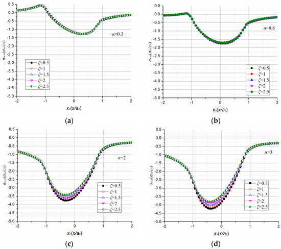 σn−xx along the intersecting line of plane xoz and interface with various α and ζ when h/ah = 0.02, μ = 2, and f = 0.1. (a) With various ζ at α = 0.3; (b) with various ζ at α = 0.6; (c) with various ζ at α = 2; (d) with various ζ at α = 3.