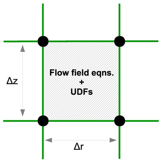 At the macroscopic level, the physio-chemical phenomena that govern the behavior of the gas-phase species are complex in nature. Mass, momentum and energy balances each play a key role in determining the growth of amorphous silicon layers within the PECVD reactor. Consequently, analytic solutions to the gas-phase model are viable only for simplified systems which fail to yield meaningful results. Instead, we employ numerical methods here which are capable of solving the complex fluid dynamics equations with high accuracy within the mesh structure presented in the previous section. At every time step, and for each cell of the mesh (e.g., Figure 4), the governing equations are discretized using the ANSYS Fluent solver via finite difference methods. Additionally, user defined functions (UDFs) are applied to each cell which allow for extended functionality of the Fluent framework.