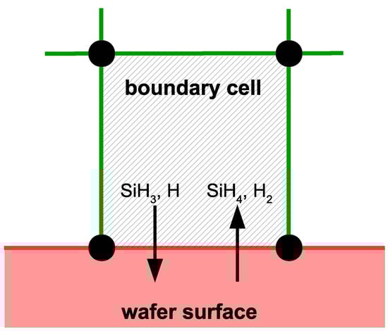 Special consideration must be taken when modeling cells that lie along the surface of the wafer (e.g., Figure 5). In addition to the previously detailed transport and reaction phenomena, the cells bordering the surface share mass and energy with the growing thin film layer. Specifically, SiH and H radicals deposit on the thin film causing a mass sink, while SiH and H desorb from the surface representing a mass source. Additionally, energy is consumed and released through the breaking and formation of covalent bonds during the chemisorption process. As a result,  and  terms have been added to the energy and mass balances, respectively. The values of these user defined terms are updated after each time step of the microscopic model to reflect the growth events that have occurred. In the interest of clarity, it is important to note here that microscopic simulations are not conducted within every boundary cell. Instead, microscopic simulations occur at discrete locations across the wafer surface (e.g., ten discrete locations from r = 0.0 to 10.0 cm are used in this work), and the appropriate mass and energy consumption for the remaining boundary cells are found via linear interpolation. After each boundary cell has been resolved, calculation of the next time step can commence.