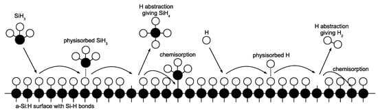 Upon striking the surface of the growing a-Si:H layer, physisorption occurs as SiH and H radicals contact hydrogenated silicon sites (Si–H) according to the following reaction set: