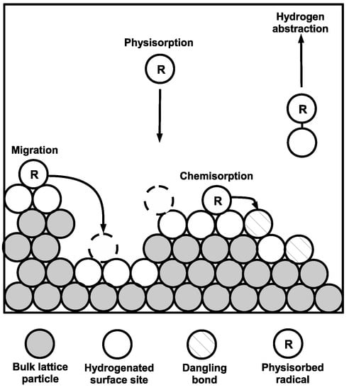 whereby a physisorbed radical removes a surface hydrogen reforming the stable species (SiH or H) and creating a dangling bond (Si) in the process, or chemisorption at a preexisting dangling bond site according to the following reactions: