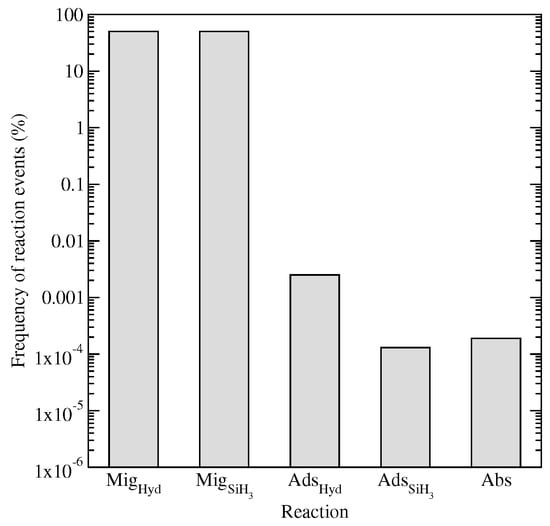 Normalized frequency of reaction events within the present kMC scheme at T = 475 K, P = 1 Torr, and a SiH mole fraction of 0.9.