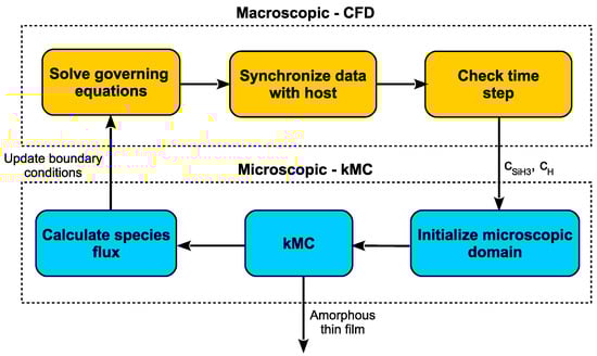 At a given time, t, the governing equations are solved within each cell of the reactor mesh. The concentrations of the deposition species of interest, SiH and H, are fed to the microscopic domain at which point the kMC model presented earlier can grow the thin film until time t is reached. The boundary cells (i.e., cells which are adjacent to the wafer surface) then receive updated boundary conditions based the the transfer of mass and energy to the microscopic domain. This cycle continues through the completion of the PECVD batch deposition. Please note, the “initialization” of the microscopic domain refers to non-trivial startup costs associated with loading the lattice from the previous cycle (i.e., initialization must be run at every time step).