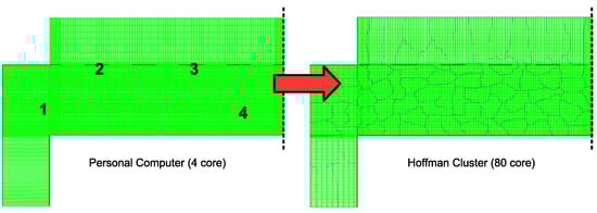 The details of the parallel algorithm and message-passing interface (MPI; Figure 12) are standard and therefore will not be discussed at this time. The recent publication of Kwon et al. [] provides further information on the parallelization strategies on which this work is based; additionally, in-depth studies of parallel processing with applications to microscopic simulations have been made by Nakano et al. and Cheimarios et al. [,]. However, as a brief outline, the process of creating a parallel program can be understood through three elementary steps: (1) the original serial task is decomposed into small computational elements; (2) tasks are then distributed across multiple processors; and (3) communication between processors is orchestrated at the completion of each time step. Here decomposition of the serial program is achieved through two separate mechanisms. First, the mesh that defines the 2D axisymmetric geometry can be discretized into a number of smaller mesh regions (see Figure 13) in which a reduced number of cells reside. For example, in the case of a typical personal computer with 4 cores, each core would be assigned roughly 1/4 of the original 120,000 cell mesh. By utilizing UCLA’s Hoffman2 computation cluster, up to 80 cores are available for parallel operation resulting in each core containing less than 2000 cells. The maximum achievable speedup given the aforementioned parallel programming strategy can be defined by: