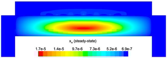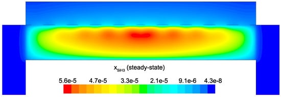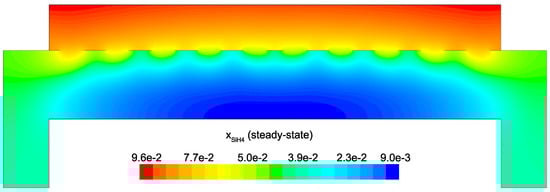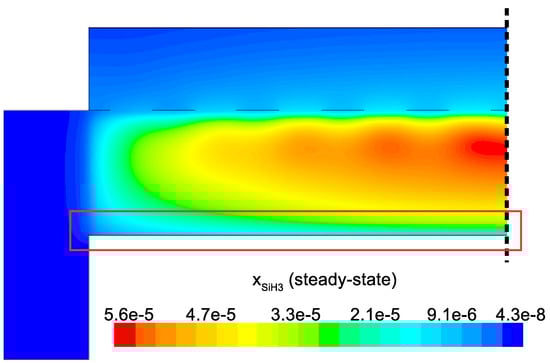 The primary motivation for the development of a multiscale CFD model for the PECVD of silicon thin films is to explore complex phenomena otherwise unobservable by a macroscopic or microscopic simulation alone. To that end, we now comment on the interconnection between these two domains. Specifically, at the macroscopic scale significant gradients exist in the concentration of the deposition species of interest, SiH and H. Meaning, microscopic simulations at various points along the surface of the wafer should yield non-uniform thin film character due to receiving spatially varying input parameters from the CFD model. This effect can be readily seen in Figure 21 and Figure 22 by narrowing our focus to the region just above the surface of the wafer. As discussed in the steady-state analysis, radial dependence of  and  develops due to consumption of the gas as it flows radially outward through the electron cloud and across the wafer. Given that growth of a-Si:H films is dependent on SiH radicals reaching the surface, it is likely that at the completion of a batch, the thickness of the thin film layer will not be uniform (further discussion of thickness non-uniformities can be found in the works of Armaou et al. [] and Sansonnens et al. []).