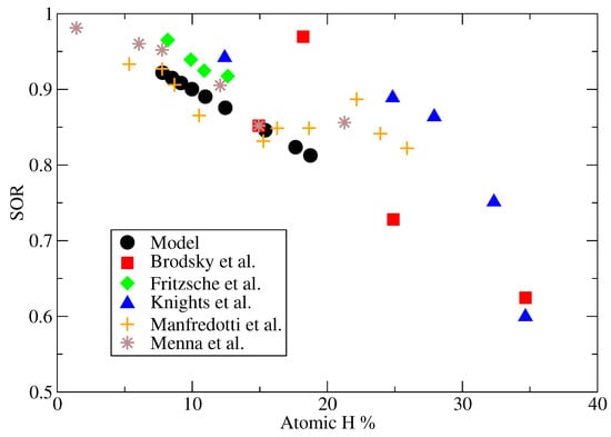 where n is the number of occupied lattice sites and  is the total number of sites within the lattice. Again, given that hydrogen persists on the interior surfaces of the film, it is expected that a strong correlation exists between the hydrogen content and SOR which will allow for a more detailed evaluation of the accuracy of the microscopic model.