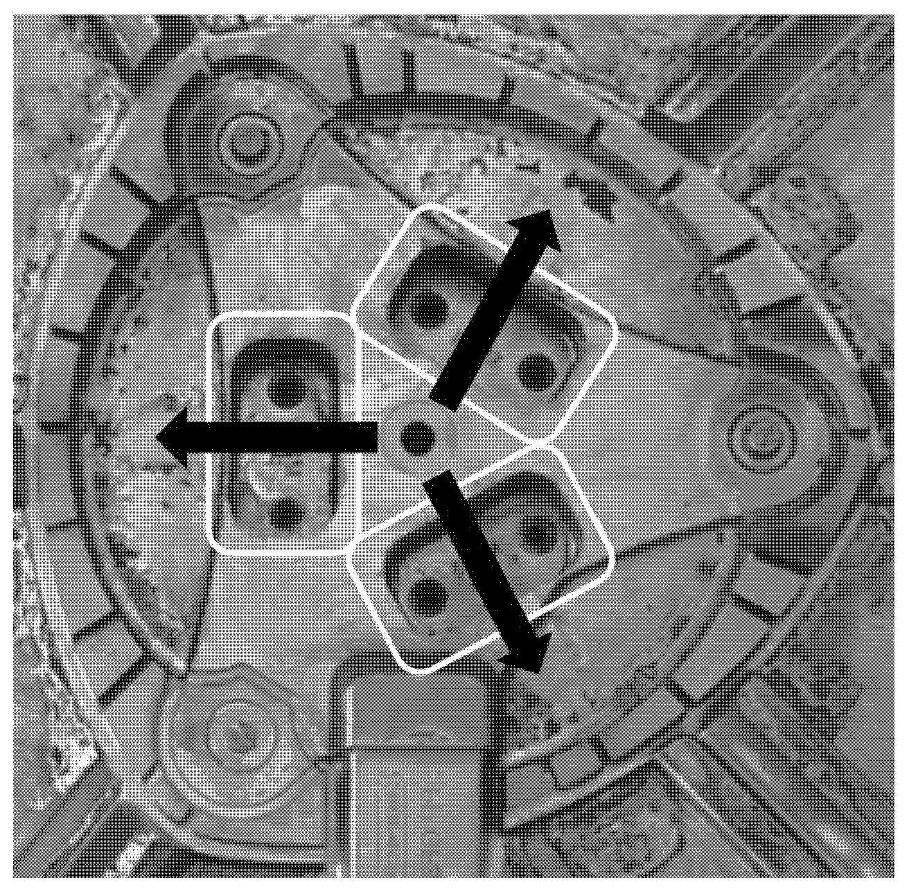 Industrial wear tests setup, showing the cavities location in the mould (white boxes) and the plastic flow (black arrows).