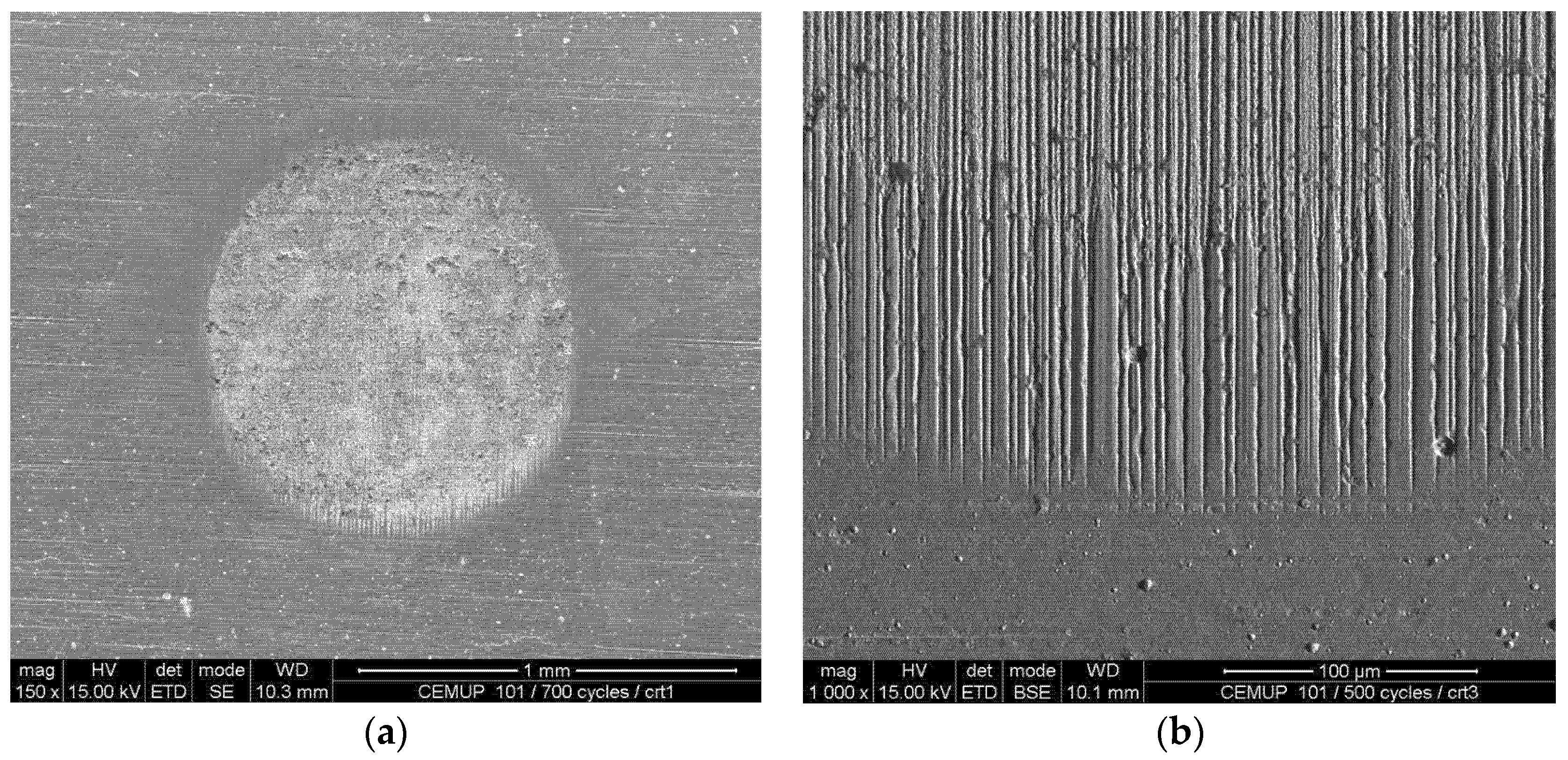 The adhesion between each coating and substrate was assessed by scratch test and Rockwell indentation. Scratch tests were carried out using a CSM REVETEST equipment (CSEM, Neuchatel, Switzerland) following the procedures recommended by the BS EN 1071-3 (2005) standard [23]. The normal load was increasing from 0 to 80 N using a growing up rate of 100 N·min−1 and the indenter sliding speed used was 10 mm·min−1. Regarding the surface texture effect due to grinding process, two orthogonal measurements were considered allowing to understand the texture effect on the adhesion failure mechanisms. In each orthogonal direction three tests were made in order to maximise the results accuracy. Then, grooves were carefully observed by optical microscopy, correlating the distance of the groove and film detachment phenomena detected on the scratch with the applied load in each point. The grooves observation lets identifying when cohesive and adhesive failures occur, allowing to determine the corresponding load. Another technique was also used permitting to confirm qualitative results. Following the VDI 3198:1991 standard [24], Rockwell indentations were done at 294 N (30 kgf) and 980 N (100 kgf) normal loads, using an EMCO M4U 025 Universal Hardness Tester (EMCO-TEST Prüfmaschinen GmbH, Kellau, Kuchl, Austria). Indentation borders were observed in order to identify the presence of cracks and its pattern.
