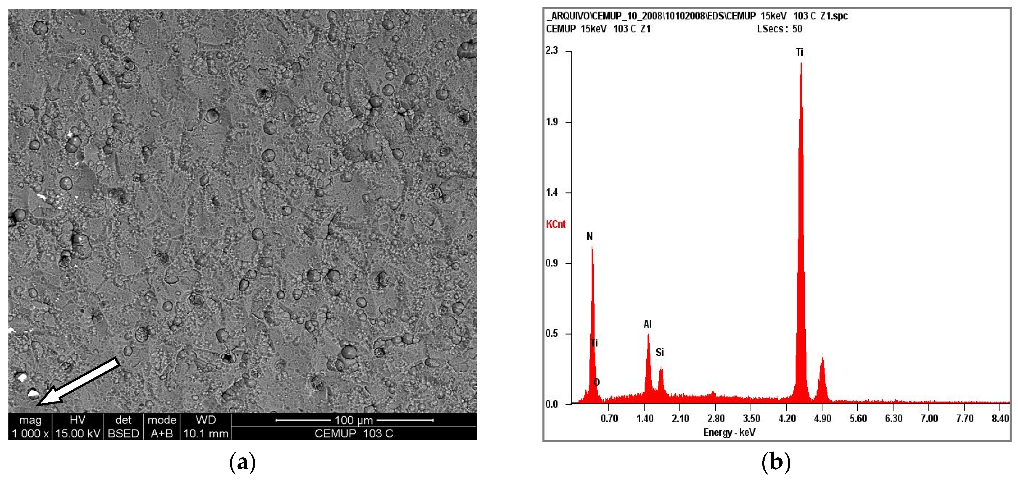 (a) Coating surface view after 90,000 injection cycles, denoting some punctual wear close to the left border of the image and (b) corresponding EDS analysis of the points indicated by the white arrow.