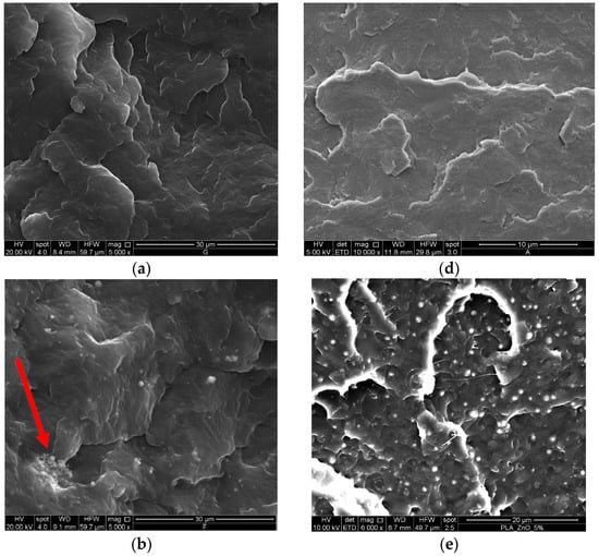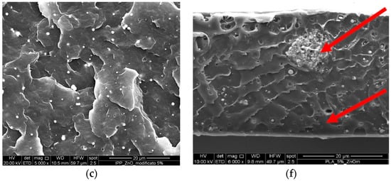 The iPP/ZnO samples are characterized by a not homogeneous distribution of the particles with the presence of agglomerates, Figure 1b. It should be noted that the ZnO particles are well embedded in the iPP matrix. For the iPP system, the coating of the ZnO with stearic acid (Figure 1c) promotes a better dispersion and distribution of the particles and prevents the formation of agglomerates []. Using the same particles, in PLA matrix it is possible to note an opposite behavior: whereas for the system PLA/ZnO, Figure 1e, the distribution of the uncoated particles in the sample is homogenous, with the particles well embedded in the matrix, for the PLA/ZnOc system, Figure 1f, agglomerations of particles are present. Moreover, the presence of holes left during the fracture with liquid nitrogen indicates a poor adhesion between matrix and particles.