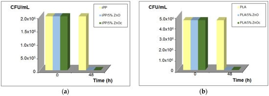 In Figure 2, the antimicrobial effect against E. coli is presented for iPP and PLA based systems. Plain polymers exhibit no bactericidal activity. When ZnO or ZnOc particles are present in both matrices after 48 h the composites show a reduction of 99.99% of E. coli, indicating that the mixing of the particles with the two matrices and the coating process do not reduce the antibacterial activity of the plain ZnO particles.