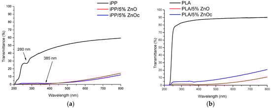 Figure 3 shows the UV-Visible spectra of iPP and PLA based composites. The two plain polymers, in agreement with literature [,], do not have a high photostability (Figure 3). In the case of iPP, UV-Vis analysis shows an absorption band at 280 nm due to the presence of some stabilizer in the commercial iPP used. The PLA transmittance starts to decrease at about 382 nm and becomes 0 at 225 nm, this saturation of the spectra at 225 nm is due to the absorbance of PLA ester groups [,]. In the presence of both ZnO and ZnOc for both polymers, an absorption band in the region around 385 nm—as indicated by arrows—is observed []. As reported in the literature, this band is due to the inherent capacity of the ZnO particles to absorb the UV light [,]. This result indicates that both ZnO and ZnOc particles are able to absorb UV light and to extend the UV absorption area of plain polymers.