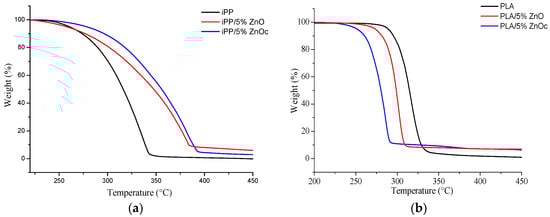 In Figure 4 the thermostability curves of iPP and PLA based composites are presented. The presence of the ZnO and ZnOc increases or decreases the thermal stability depending on the type of the polymer into consideration. For the iPP/ZnO and iPP/ZnOc systems, there is a delay in the temperature of starting degradation, compared to iPP, and a consistent increase of the temperature at which the weight of the sample is reduced of the 50% (T50%) (see Table 1).