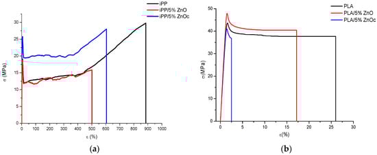 Stress-strain curve of iPP (a) and PLA (b) based systems.