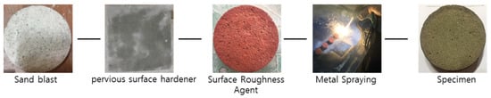 Test pieces were produced with different sizes using 24 MPa concrete, as shown in Figure 3. To secure the bond strength between the metal spray coating and the concrete, the surfaces of the prepared concrete were sand-blasted. To increase the tensile strength of the concrete surfaces after the sand-blasting treatment, a pervious surface hardener was applied. Then, a surface roughness agent was applied, to increase the roughness. The different surface treatments were then applied to the test pieces.