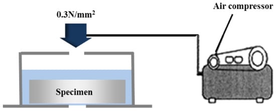 The water impermeability was evaluated in accordance with KS F 4919 [29]. The lateral faces, excluding the surface on which the metal was sprayed and the opposite face, were completely sealed with an epoxy resin. A water pressure of 0.3 N/mm2 was applied to the specimen for 3 h by using the equipment shown in Figure 5. Then, moisture was lightly removed for about 10 s by using a piece of filter paper [30], as per KS M 7602. The mortar bottom plate beneath the sprayed metal surface at the center of the specimen was visually checked to see if it was wet with water. The difference between the weight before the water pressure was applied (W1) and the weight after the water pressure was applied (W2) was set as the amount of water permeation based on KS F 4930 [31], and the permeability ratio was calculated as follows: