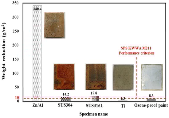 To determine the metal spray with the highest ozone resistance, the weight reduction after ozone treatment was evaluated. Figure 6 shows the results. The Zn/Al alloy showed the largest weight reduction of 340.4 g/m2, which confirmed that it is most vulnerable to ozone. SUS304 and SUS316L, which are known to have a strong chemical resistance, showed reductions of 14.2 and 17.8 g/m2, respectively. These materials are vulnerable to ozone because the metal is arc-discharged at a high temperature when sprayed, and the Fe–Ni–Cr structure of stainless steel is destroyed when heat-treated at a high temperature. This causes the Fe component to move to the surface of the sprayed metal in large quantities [32]. The ozone-proof paint showed a weight reduction of 8.3 g/m2. Ti showed almost no weight reduction, with a value of 1.3 g/m2. Thus, only Ti and the ozone-proof paint satisfied the performance criterion of SPS KWWA M211 (i.e., 10 g/m2).