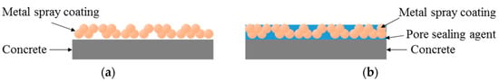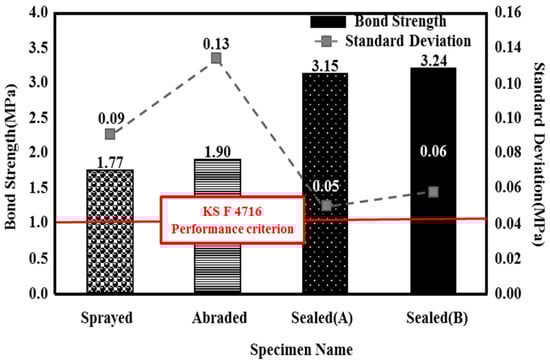 The sealed (A) and sealed (B) specimens showed a superior bond performance to the sprayed specimen, by about 1.8 times (3.15 and 3.24 MPa, respectively), regardless of the type of pore sealing agent. This may be because many pores are generated on the film by the metal spray method [25]; when a pore sealing agent is applied to such a film, it permeates and plays the role of an adhesive between the metal spray coating and concrete, as shown in Figure 8. This enhances the adhesion performance. The sprayed specimen showed the lowest bond strength of 1.77 MPa. However, it satisfied the bond strength performance criterion of 1.1 MPa, as stated in in KS F 4716. Although the abraded specimen showed a bond strength of 1.90 MPa, which was higher than that of the sprayed specimen, the standard deviation was relatively high, at about 0.13. This may be because the error range of the experimental values increased due to the impact applied to the film during the surface polishing process.