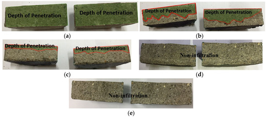 Results of the impermeability test: (a) mortar; (b) sprayed; (c) abraded; (d) sealed (A); and (e) sealed (B).