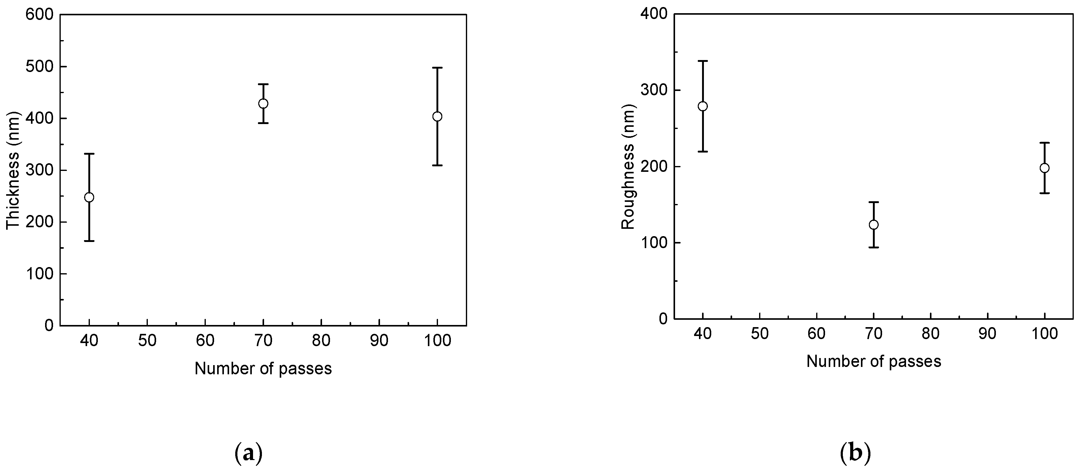 Figure 10, the spray-on films made using 70 passes show the minimum standard deviation in their thicknesses. The same films have the lowest roughness as well (