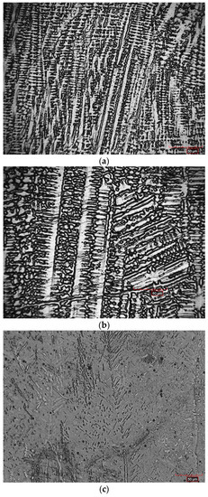 Images reveal a columnar dendritic microstructure in all the AlxCoFeNiCu1−x (x = 0.25, 0.5, 0.75) high entropy alloy deposits. (a) Al0.25CoFeNiCu0.75; (b) Al0.5CoFeNiCu0.5; (c) Al0.75CoFeNiCu0.25.