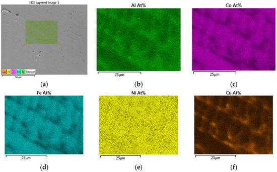 EDS elemental maps of Al0.75CoFeNiCu0.25 alloy from the region of interest shown in Figure 7a. (a) EDS layered image; (b) Element map of Al; (c) Element map of Co; (d) Element map of Fe; (e) Element map of Ni; (f) Element map of Cu.