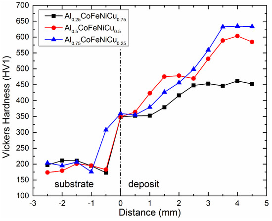 The hardness distribution curves of AlxCoFeNiCu1−x (x = 0.25, 0.5, 0.75) high entropy alloys samples are shown in Figure 11. The hardness curves were gathered along the height of the deposit. Indentations were gathered from the substrate SS304 and continued into the deposit. A fixed spacing of 0.5 mm was used between indentations.