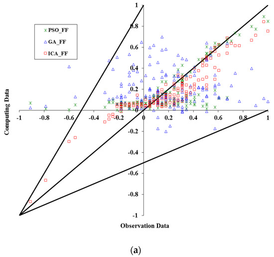 In order to evaluate the accuracy of the ICA-ANN model, which has been optimized by the ICA, it was compared with both the GA and PSO, the features of which are provided in Table 6. The ICA-ANN model with a 1-5-6-5 structure and the TANSIG stimulation function were used. According to a study conducted on three algorithms for training data and testing, R2 coefficients and the slope of the straight line are presented in Table 7. Figure 5 shows graph cost for 250 iterations in the 250GEN_5IN model. Figure 6 shows the comparison of the fb values for the computational and observational data using the three algorithms in the training stage. According to the equations of lines fitted to the computational and observational values in each model, and also the coefficient of determination that corresponds to them (Table 7), it can be seen that the ANN optimized by the ICA determines the amount of fb more accurately than the GA and PSO algorithms. Moreover, the determination of fb using the three models shown in Figure 6 indicates that the ANN optimized by the ICA has higher accuracy and flexibility.