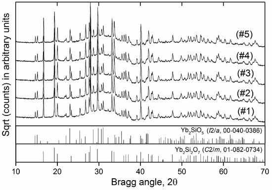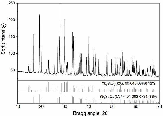 Commercially available Si and Yb2Si2O7 powders provided by Oerlikon Metco (US) Inc. (New York, NY, USA) were used in this study. The details about the two kinds of powders are given in Table 1. The elemental analysis of the Si powder, determined by inductively coupled plasma optical emission spectroscopy (ICP-OES, TJA-Iris-Intrepid, Thermo Scientific GmbH, Kleve, Germany), revealed 98.7 wt % ± 0.7 wt % purity. The phase composition of the Yb2Si2O7 feedstock was determined with an X-ray diffractometer (XRD, D4 Endeavor, Bruker AXS GmbH, Karlsruhe, Germany) (Cu Kα radiation, operating voltage 40 kV, current 40 mA, step size 0.02°, step time 0.75 s) over a 2θ-range of 10°–80°. The deconvolution of the XRD peaks for quantitative phase analysis was performed using Rietveld analysis (TOPAS Software, Bruker AXS GmbH, Karlsruhe, Germany). The XRD analysis of the Yb2Si2O7 powder, as shown in Figure 1, yielded a crystalline structure with the presence of monoclinic Yb2Si2O7 (C2/m, JCPDS No 01-082-0734) and secondary monoclinic Yb2SiO5 (I2/a, JCPDS No 00-040-0386) phases. According to the Rietveld analysis, the powder was found to contain 88 wt % and 12 wt % Yb2Si2O7 and Yb2SiO5, respectively.